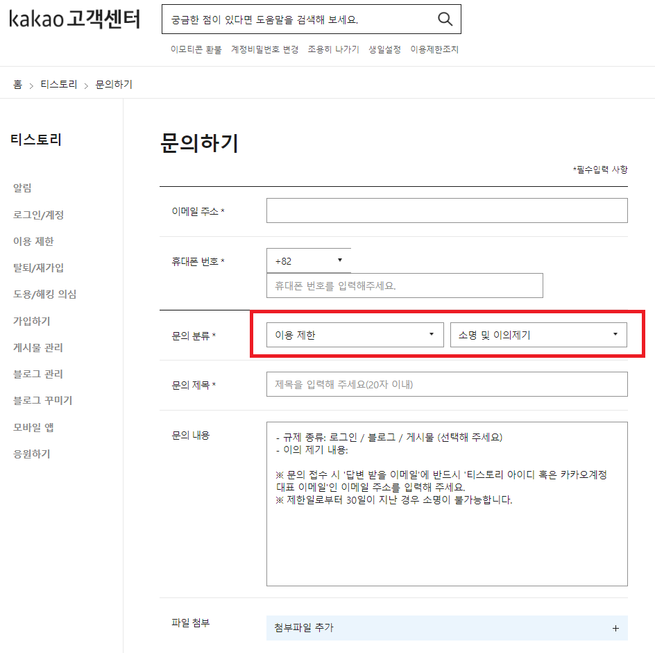 ▶ 문의하기 화면에서 문의 분류는 '이용제한' - '소명 및 의의제기'를 선택하시고 문의하시면 됩니다.